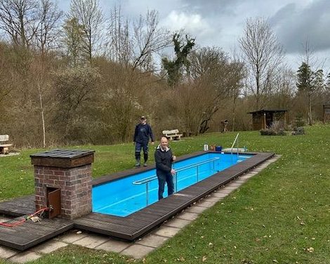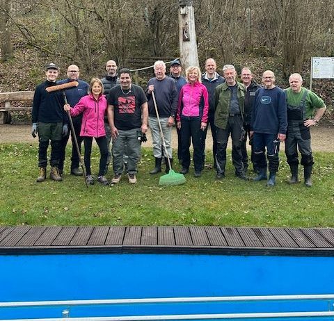 Insgesamt 13 Ehrenamtliche machten die Anlage am Ostersamstag fit für den Saisonstart., Sie befreiten die Umgebung von Laub und Ästen, reinigten die Sitzgelegenheiten und kümmerten sich anschließend um das Herzstück der Anlage: Das Tretbecken erhielt einen frischen Anstrich und der hölzerne Beckenumlauf wurde sorgfältig geölt. Dank dieses gemeinschaftlichen Einsatzes präsentiert sich das Solmser Tretbecken nun wieder einladend und ist bereit für die neue Saison.